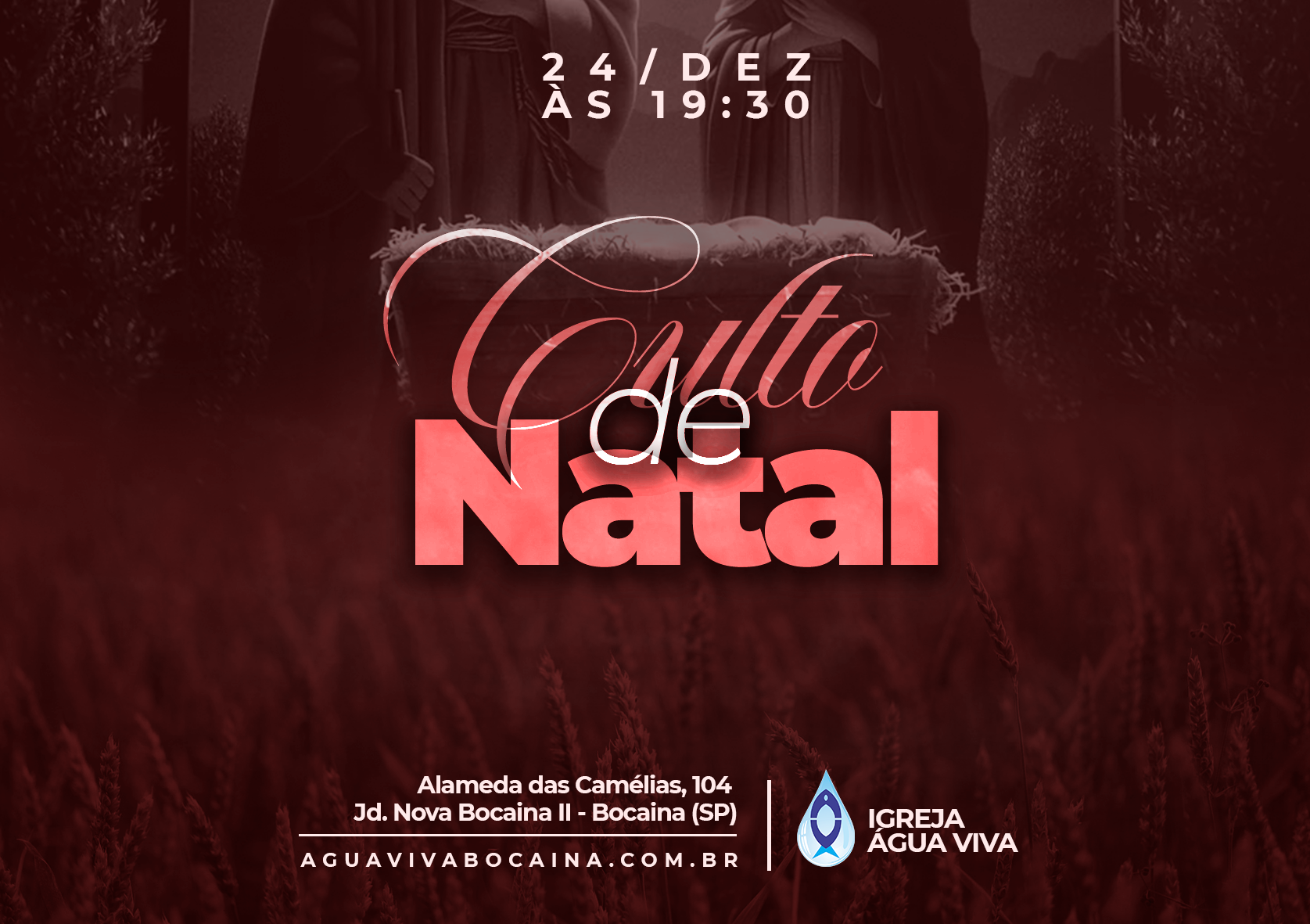Culto de Natal novembro 8, 2025 Início 2025-12-24 19:30 Término 2025-12-24 21:00 Endereço Alameda das Camélias, 104 - Jd. Nova Bocaina II - Bocaina (SP) Descrição Um tempo sagrado de comunhão e renovação espiritual. Na Ceia do Senhor, lembramos do sacrifício de Jesus e reafirmamos nossa fé e aliança com Ele. Venha participar desse momento especial de gratidão, reflexão e unidade no corpo de Cristo. ✝️